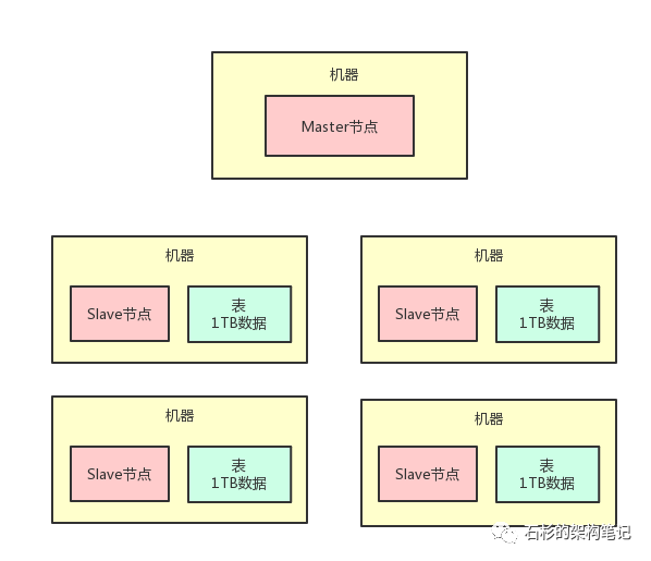 举个例子,比如总共 20TB 的数据,在每台机器上只要放 1TB 就可以了,1TB 应该还好吧?每台机器都可以轻松加愉快的放下这么多数据了。