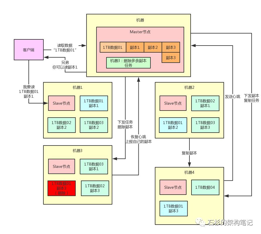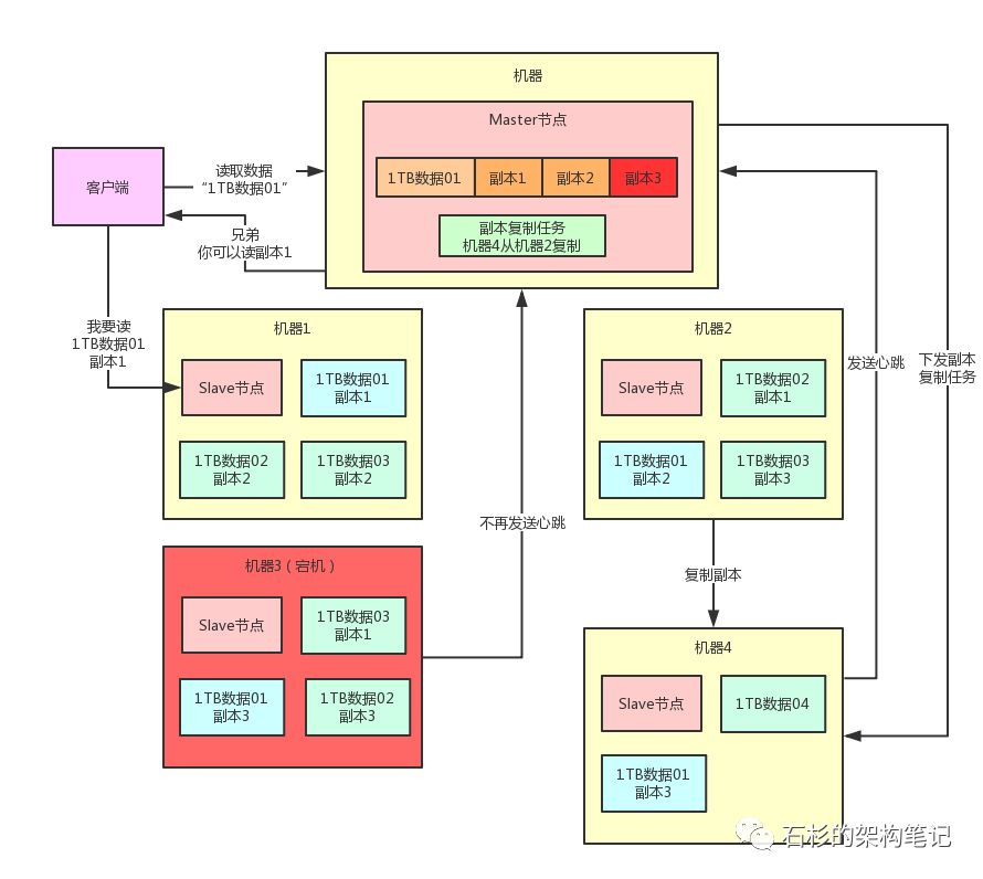 那么此时,Master 节点就可以通知人家去读“1TB 数据 01”的副本 1 或者副本 2,哪个都行,因为那两个副本其实还是在的。
