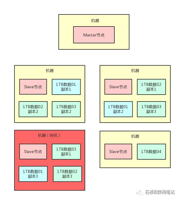 这样的话,一份数据就有了 3 个副本了。其他的数据也是类似。这个时候我们假设有一台机器宕机了,比如下面这台机器宕机,必然会导致“1TB 数据 01”这个数据分片的其中一个数据副本丢失。