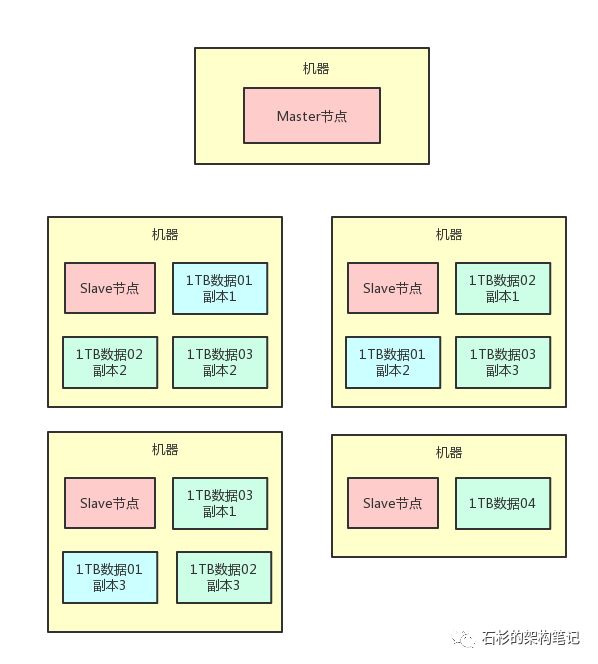 看上图,现在机器 4 上是不是又多了一个“1TB 数据 01”的副本 3?那么“1TB 数据 01”这个数据分片是不是又变成 3 个副本了?