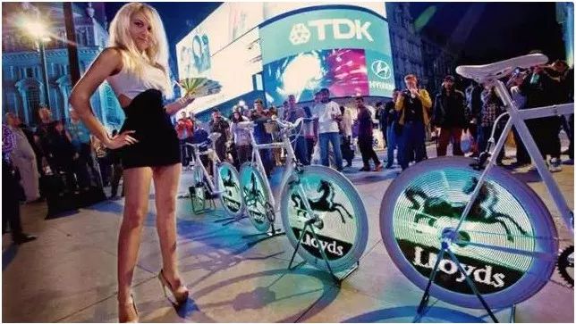 Kino-mo还曾把产品和自行车融合,推出过专门针对自行车的广告设备Video bike,将Video bike当作车轮胎里钢丝进行装备,通过相应的调整,可以将LED很好的嵌入进车轮胎中,当车上开始骑行时,车轮转动,LED也便开始显示相应动态的画面,2014年年底,英国曼彻斯特的LLoyds银行就曾采用Video bike进行营销。