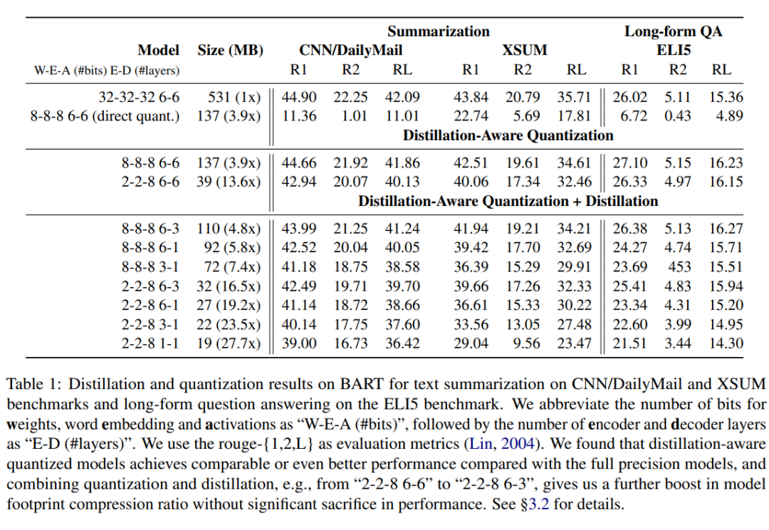 为解决这个问题,本文同时使用了模型蒸馏和模型量化两种方式,将 BART 模型压缩了 16.5 倍,在多个摘要和 QA 数据集上达到了与原模型相当的表现。