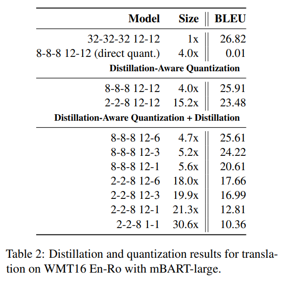 由于普通 BART 没有多语言模型,所以本文在 mBART-large 上使用了模型蒸馏和模型量化,来探究其在机器翻译上的表现。在 WMT 英文-罗马尼亚语翻译任务上进行了实验,结果如下表所示: