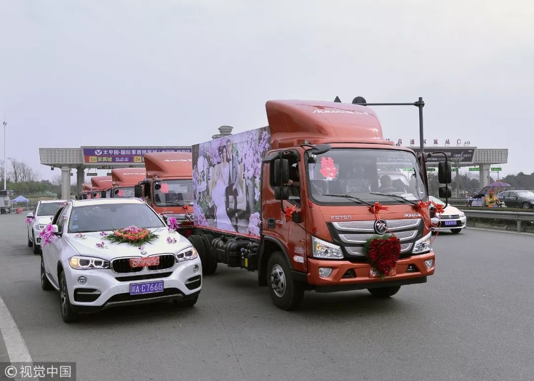 成都一对新人,觉得豪车不够气派,车队用了数辆大红色货车,载着婚礼所用的新郎新娘巨幅海报,每辆货车上都装点着玫瑰花 / 视觉中国