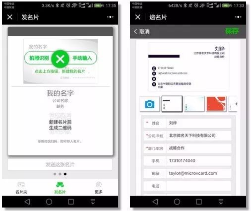 一键转发给个人或微信群。收发一张名片耗时2秒。对于收到的名片,用户还可以将信息保存到通讯录,一键拨打电话或者进行转发和删除的操作。如果对对方感兴趣,也可将自己的名片回发给对方。