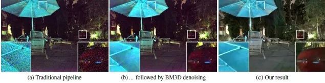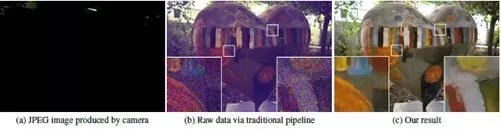 图2 (a) 富士X-T2相机在夜间拍摄的ISO 800,光圈f / 7.1和曝光1/30秒的图像。相机的照度约为1lux(b)基于传统流程处理的结果,不能有效处理噪声和数据中的颜色失真。(c)文章处理的结果