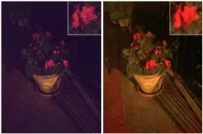图5 带有ISO 400,光圈f / 2.2 的iPhone 6s在夜间拍摄的曝光时间为0.05s的原始图像,(a) 基于传统流程处理以及匹配参考图像亮度处理后得到的结果(b)文章的结果