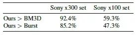在处理具有挑战性的sony x300图片时得分高于基于BM3D和多帧处理的结果。在处理较为简单的sony x100图片时得分与基于BM3D和多帧处理的结果旗鼓相当
