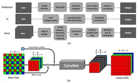 (a)从上至下分别是:传统图像处理流程,L3流程以及多帧图像处理流程(b)文章的流程