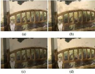 (a) Sony x100数据集中由直方图拉伸得到的参考图像(b)在直方图拉伸的图像上进行训练得到的结果,图像中的墙上有伪影(c)在未进行直方图拉伸的图像上进行训练,尽管得到的图像比较暗但是很干净(d)在(c)上进行直方图拉伸做后处理