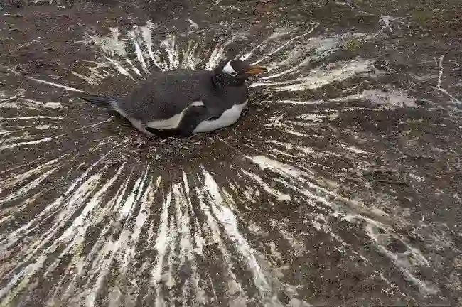 在繁育期,企鹅不会离开心爱的蛋去远处上厕所,它们只是站在自己的巢边上,撅起屁股——pppppppuuu——!时间长了,喷的次数太多,以至于以巢为中心,形成了便便结界