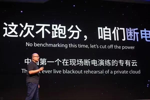 发布会现场,阿里云副总裁李津对部署了阿里云专有云的数据中心进行了现场模拟断电,一路机柜被直接拔掉了电源以后,专有云中的业务依然照常运行。