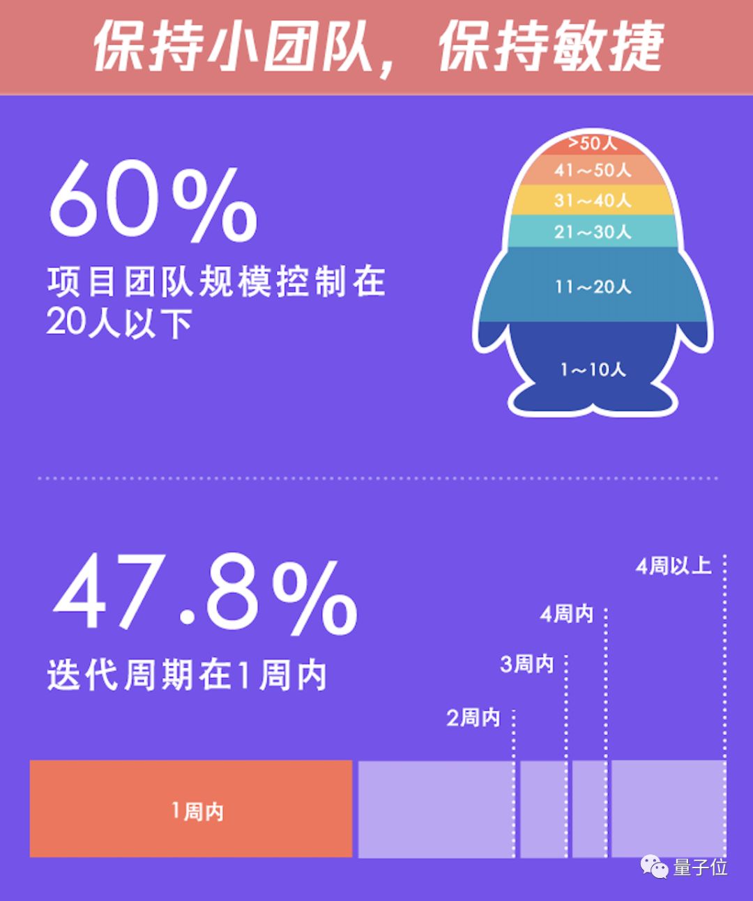 虽然腾讯研发人数众多,但研发的团队规模并不大——60%的项目团队规模控制在20人以下,并且47.8%的迭代周期在1周内。