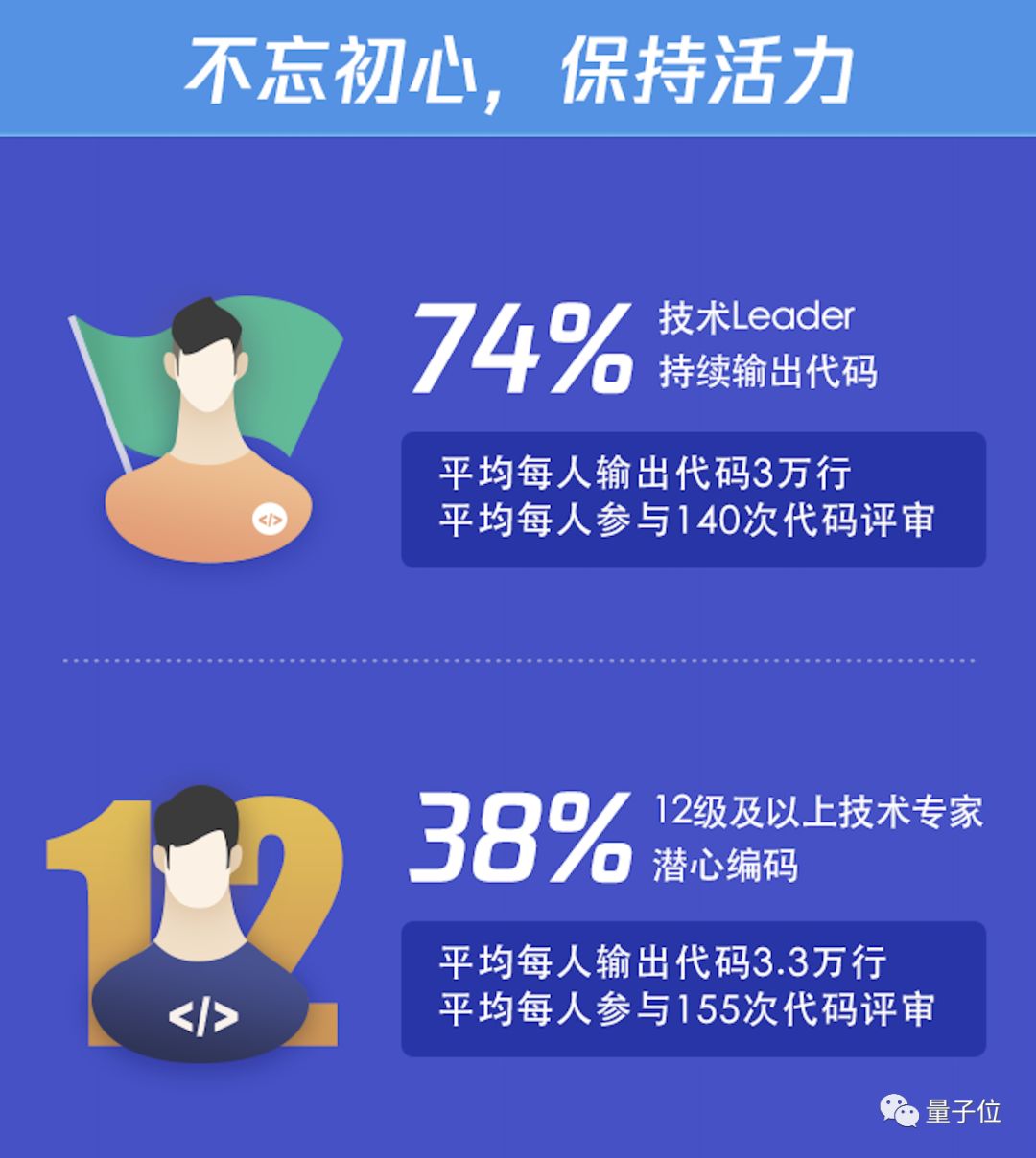 不仅仅只有普通员工写代码,腾讯74%的技术leader在持续输出代码,平均每人输出代码3万行(略少于预估出来的平均水平);参与140次代码评审。