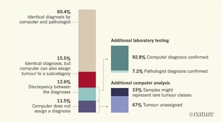 作者比较了计算机和病理学家所做的诊断。在60.4%的样本上,AI系统和病理学家诊断是一致的。15.5%的样本AI系统和病理学家的也是一致的,只不过AI系统认为,它们应该属于一个更小的亚型。还有12.6%的病例,AI系统和病理学家诊断的结果不一致。经过更加深入的分析(例如基因测序)之后,92.8%的样本是AI系统正确。