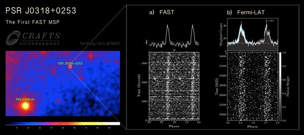通过跟踪伽马射线点源 3FGL J0318.1+0252,FAST 于2月27日首次发现这颗毫秒脉冲星,并通过 FAST 与费米伽马射线卫星大视场望远镜(Fermi-LAT)的国际合作认证了此次新发现。