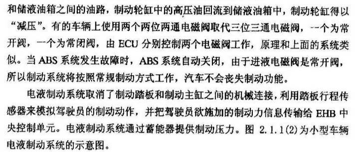辅助功能:集成有 ABS ( Anti- lock Braking System, 防抱死 制动系统 ) 、TCS (Traction Control System, 牵引力控制系统 ) 及 ESP ( Elec tronic S tability Program, 电子稳定性程序 ) 、EBD ( Electronic Brake D istribution, 电子制动力分配 ) 等主动安全控制系统的制动系统