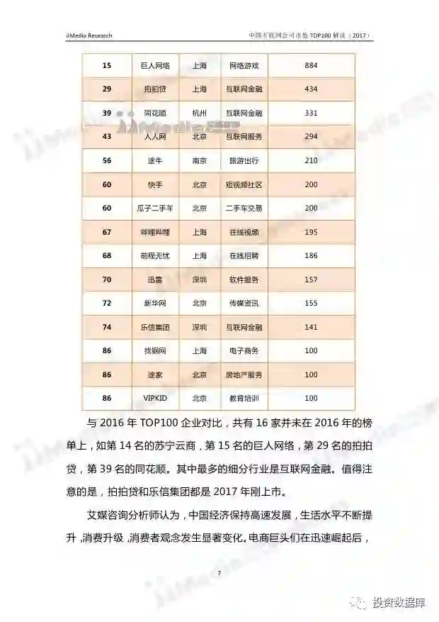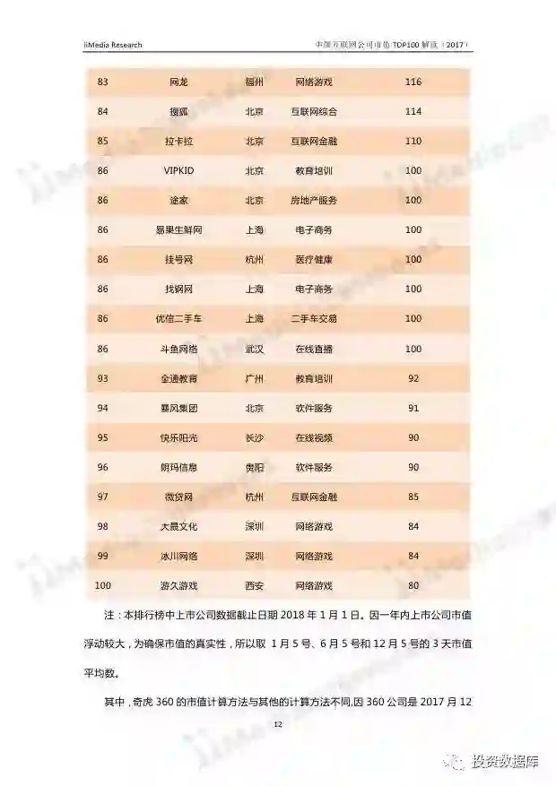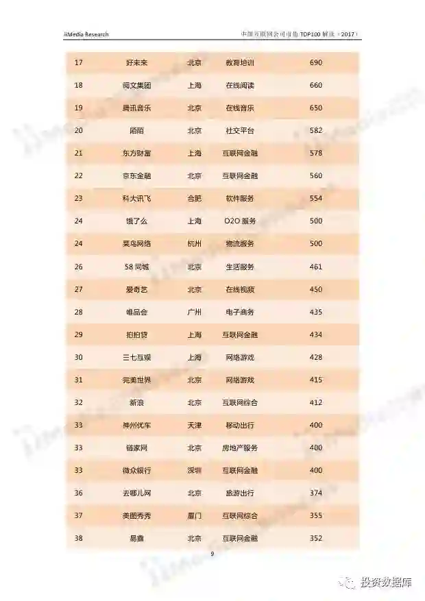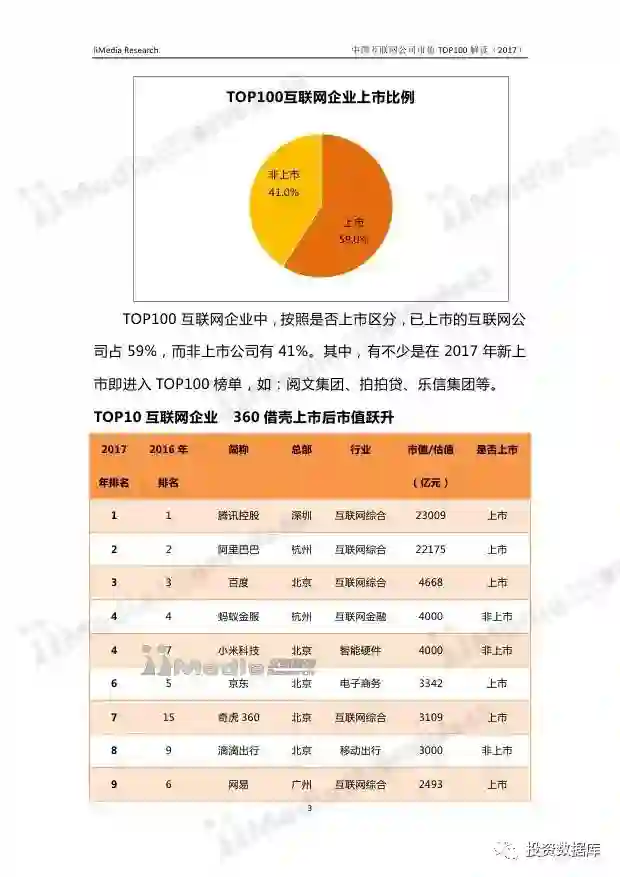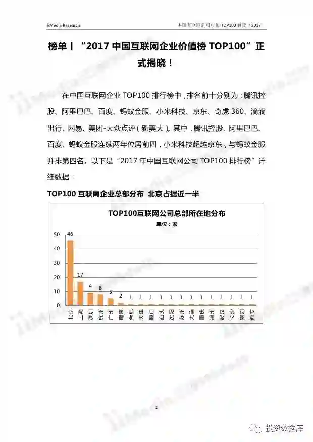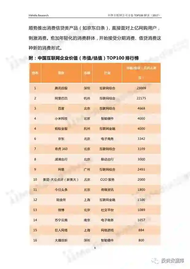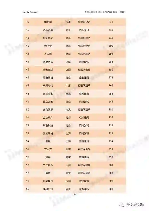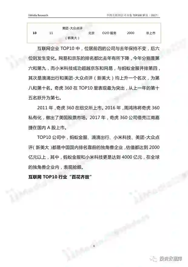 在中国互联网企业TOP100排行榜中,排名前十分别为:腾讯控股、阿里巴巴、百度、蚂蚁金服、小米科技、京东、奇虎360、滴滴出行、网易、美团-大众点评(新美大)。其中,腾讯控股、阿里巴巴、百度、蚂蚁金服连续两年位居前四,小米科技超越京东,与蚂蚁金服并排第四名。