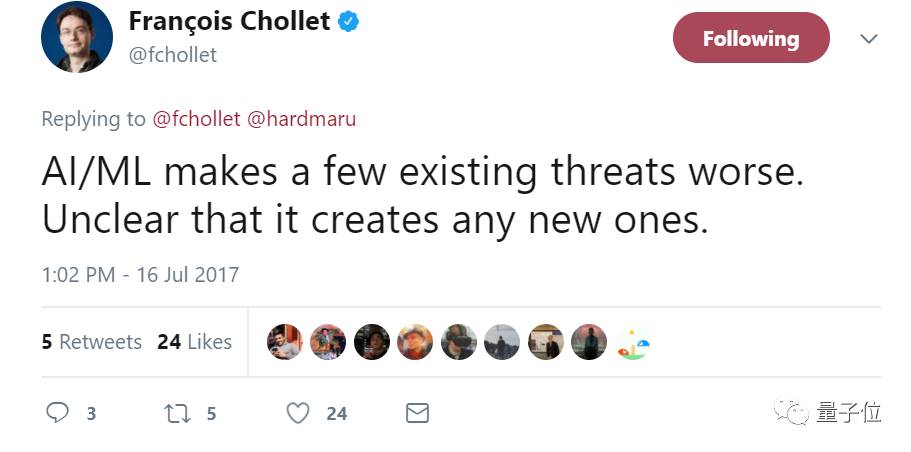 谷歌深度学习研究人员Francois Chollet对马斯克的立场表示怀疑,他在推特上说,虽然人工智能与机器学习使一些问题变得更糟,但“尚不清楚”它创造了新的问题。