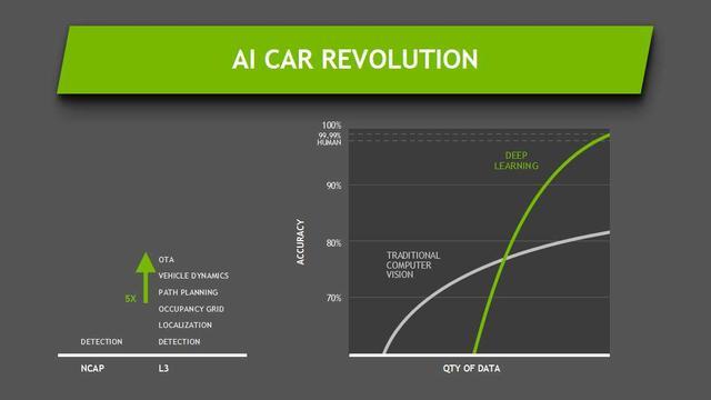 刚才讲过把自动驾驶分解到几种场景,自动驾驶其实对比之前的辅助驾驶ADAS是完全不一样的方式去实现。通过刚才把自动驾驶分成几个模块之后,发现自动驾驶很大程度上依赖于深度学习,因为深度学习在做感知的时候有很好的效率和准确度。第二是自动驾驶是依托于高精度地图。第三是自动驾驶一定是对AI计算、计算力有很强的要求。