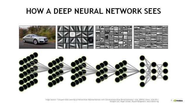 这是一个原始的汽车,浅层的神经网络看到的前面的特征,然后把不断的特征做叠加,最后会识别出车,所以这是神经网络大概比较浅显的一种解释。