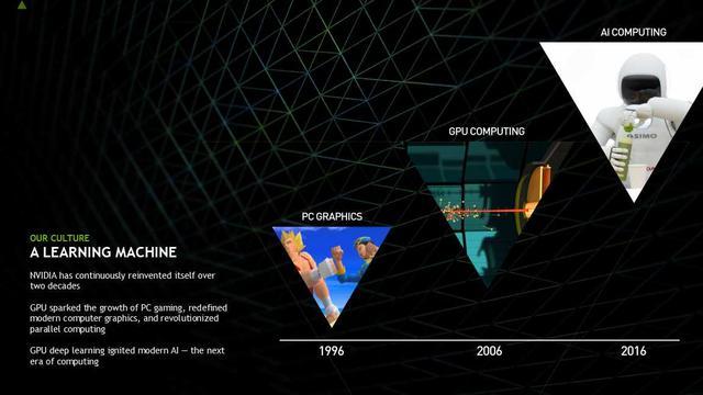 英伟达是一个最早做传统的视觉计算的一家美国公司,我们这个公司的特点是公司非常专注,从最早做GPU开始一直专注在做视觉计算领域。随着时代的发展,在2006年我们的GPU应用于加速计算,这是一个崭新的领域,针对不同的视觉计算的市场是一个崭新的领域。在2016年英伟达顺应了AI时代的发展,我们整个的处理器、公司的平台向AI去倾斜,所以现在英伟达不光是一家视觉计算的公司,其实是一家AI计算的公司。(关于英伟达的转型,我们曾有过报道:历史转折中的英伟达:百亿豪赌出奇迹 实习生项目救主)