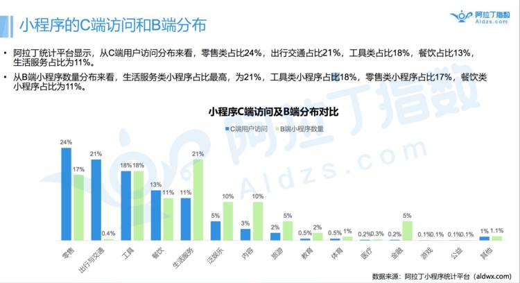 在这次阿拉丁发布的小程序 Top200 榜单中,工具类小程序占比为 30%,位列第一;零售类占比 21%,排在第二,相较于 Q2 的 11% 有了明显的提升。同时在 Top 5 中,零售占据了 2 席。