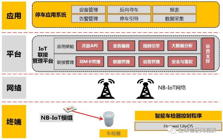 车联网解决方案支持面向前装市场和后装市场,由车载终端、无线网络接入、OceanConnect IoT平台和业务应用几部分组成。OceanConnect IoT平台作为关键平台层,起到承上启下的作用。