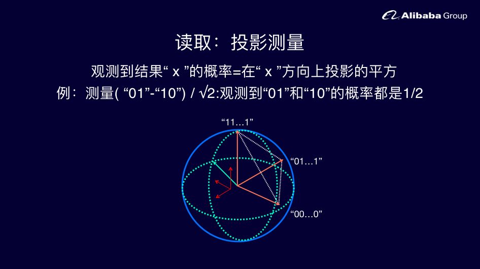做投影测量的时候,相当于把当前向量(绿色)分解到基向量的几个方向(红色)。我们会观察到一个随机的基向量对应的结果,对应的概率是该投影长度平方。