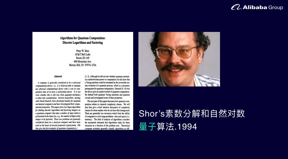 1994年,Peter Shor一篇论文里提出素数分解和自然对数的量子算法。
