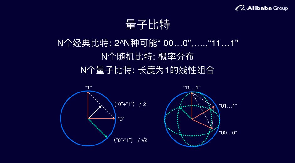 N个经典比特有2的N次方种可能;N个随机比特是2的N次方个可能的概率分布;N个量子比特是这些经典状态的长度为1的线性组合。