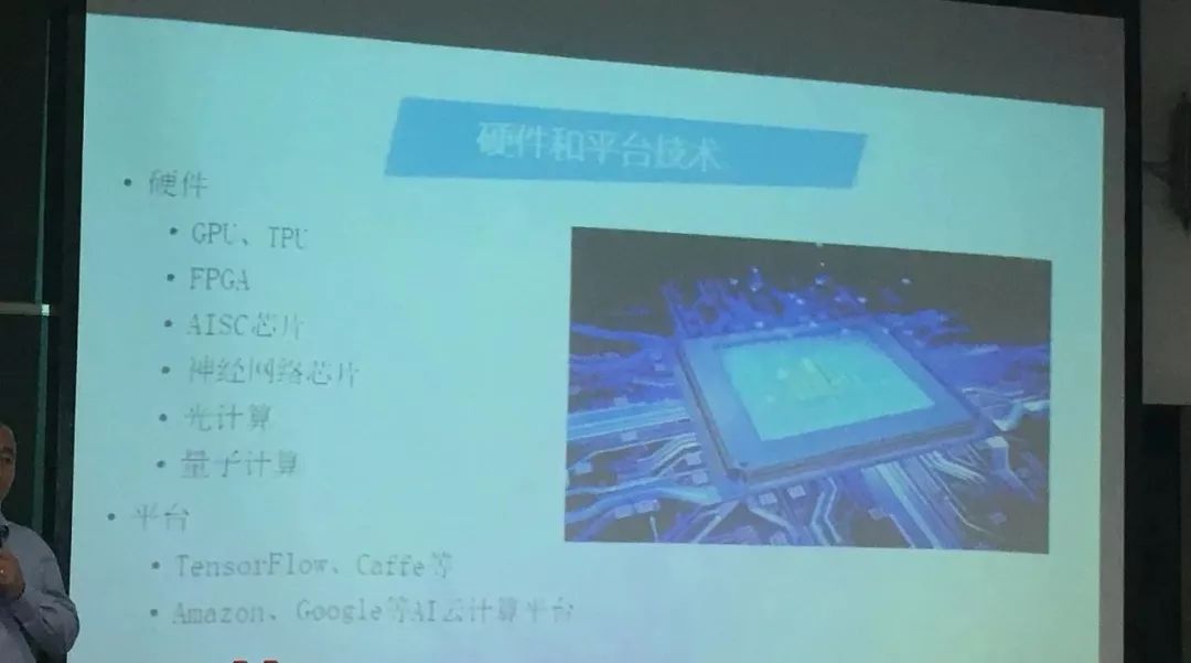 硬件方面,现在有GPU、TPU,FPGA是介于AISC芯片和GPU、TPU中间的芯片。