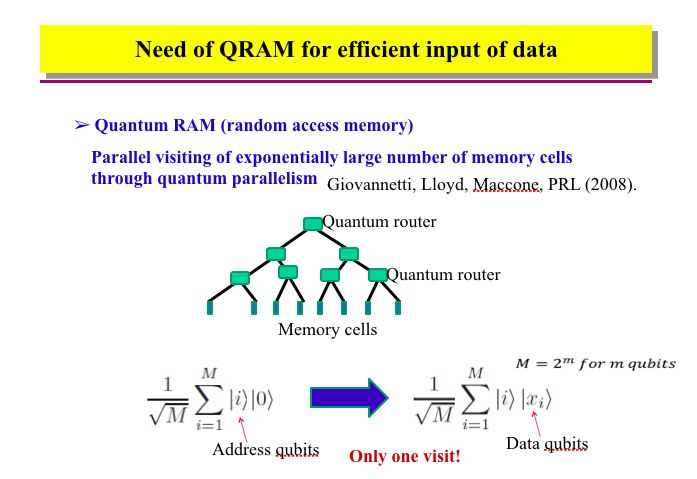 如果量子RAM(random access memory)可以实现,能够将大数据转化输入成量子态,从而在提取的过程中要实现指数加速,实现并行量子访问。