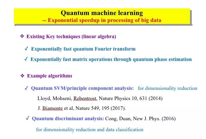 在算法上,也有一些直观的突破。其中包括MIT提出的量子支持向量机/主成分分析,它不是深度学习算法,是比较古典的算法,但在某些特定条件下,有可能实现量子指数加速。