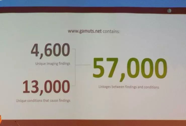 这张 Slide 充分说明了 radiology 的复杂度。根据经典的 gamuts.net, 一共有 4600 unique imaging findings,13000 unique conditions that cause findings, 57000 linkages between findings and conditions。