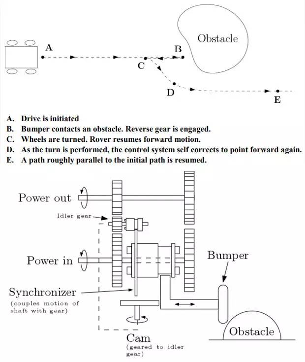比如,上图所示的障碍躲避系统是由一根保险杆、一个倒档传动装置和凸轮组成的。当探测器的保险杆在正常行进模式中遭遇障碍物,倒档装置会被同步器触发,凸轮转动,使探测器反向行驶;凸轮转动一周后,会将探测器调整回前进模式;在倒车结束时,另外一个凸轮可以帮助车轮转向,以便调回前进模式的探测器能向其他方向继续行进 (如果使用车轮而不是履带式结构的话)。
