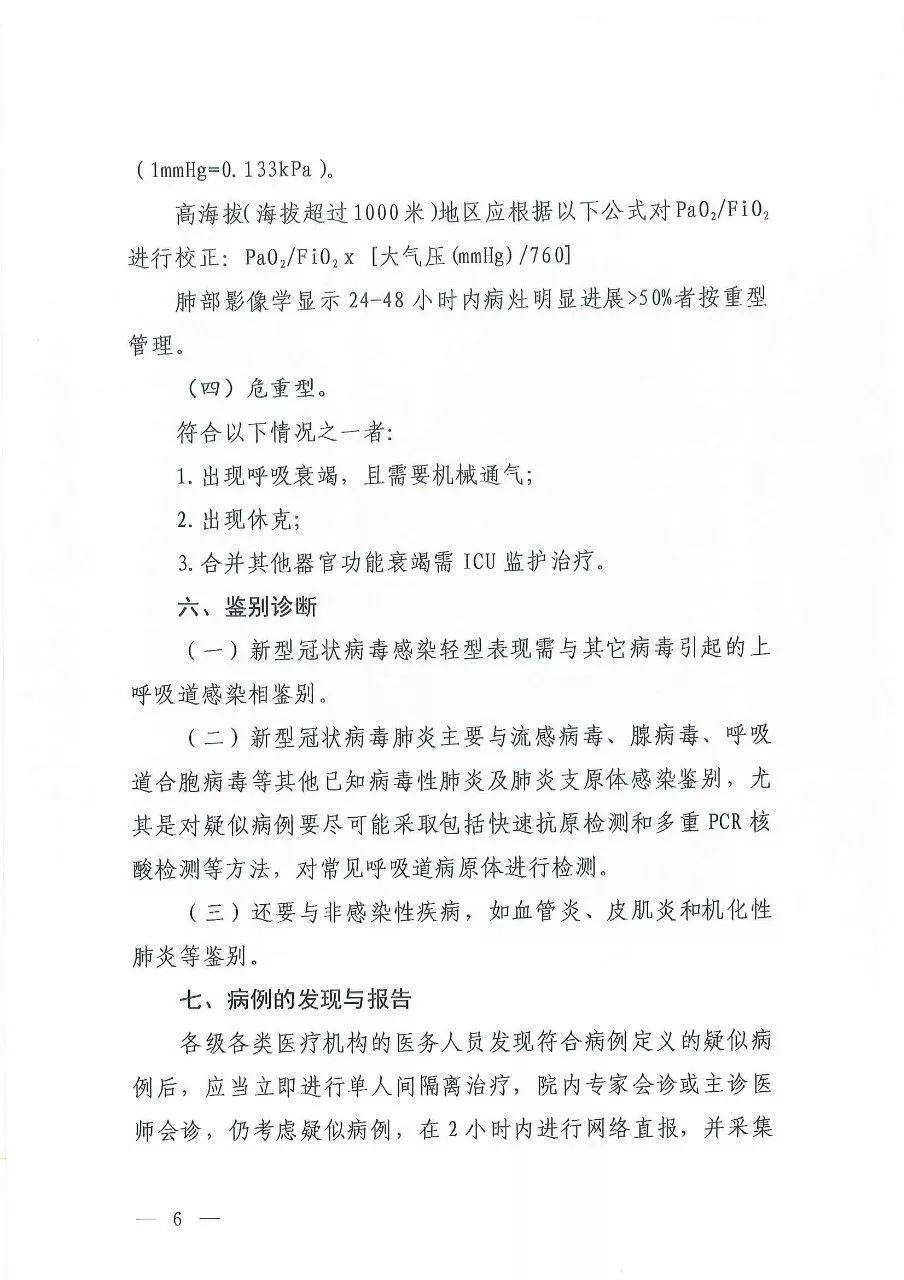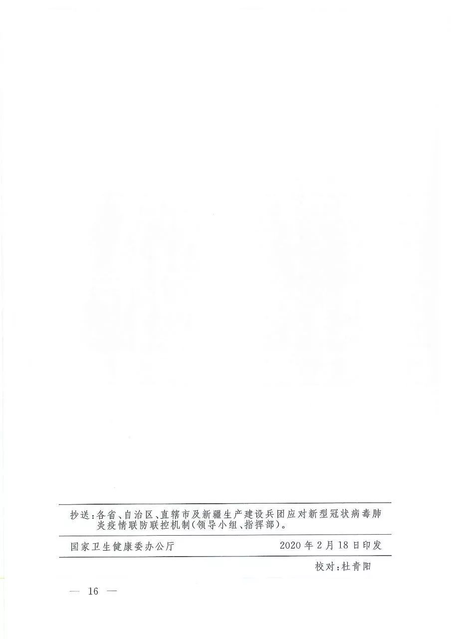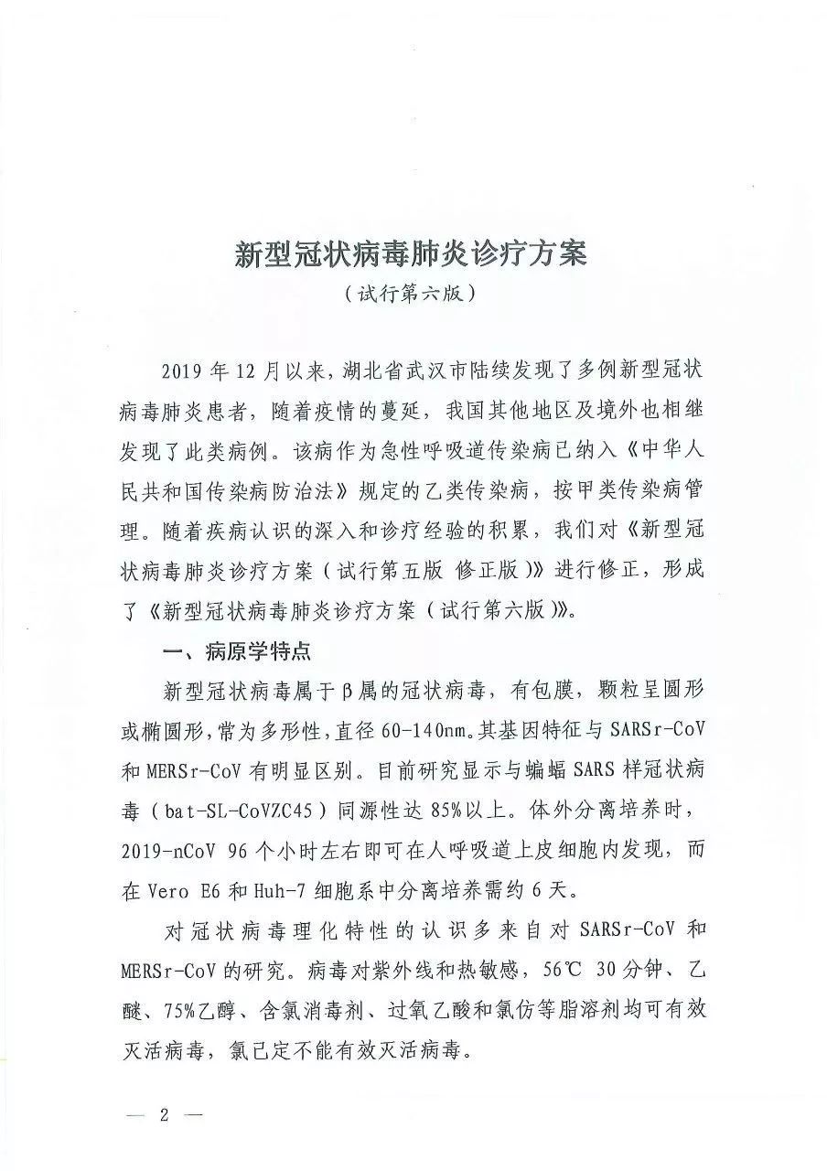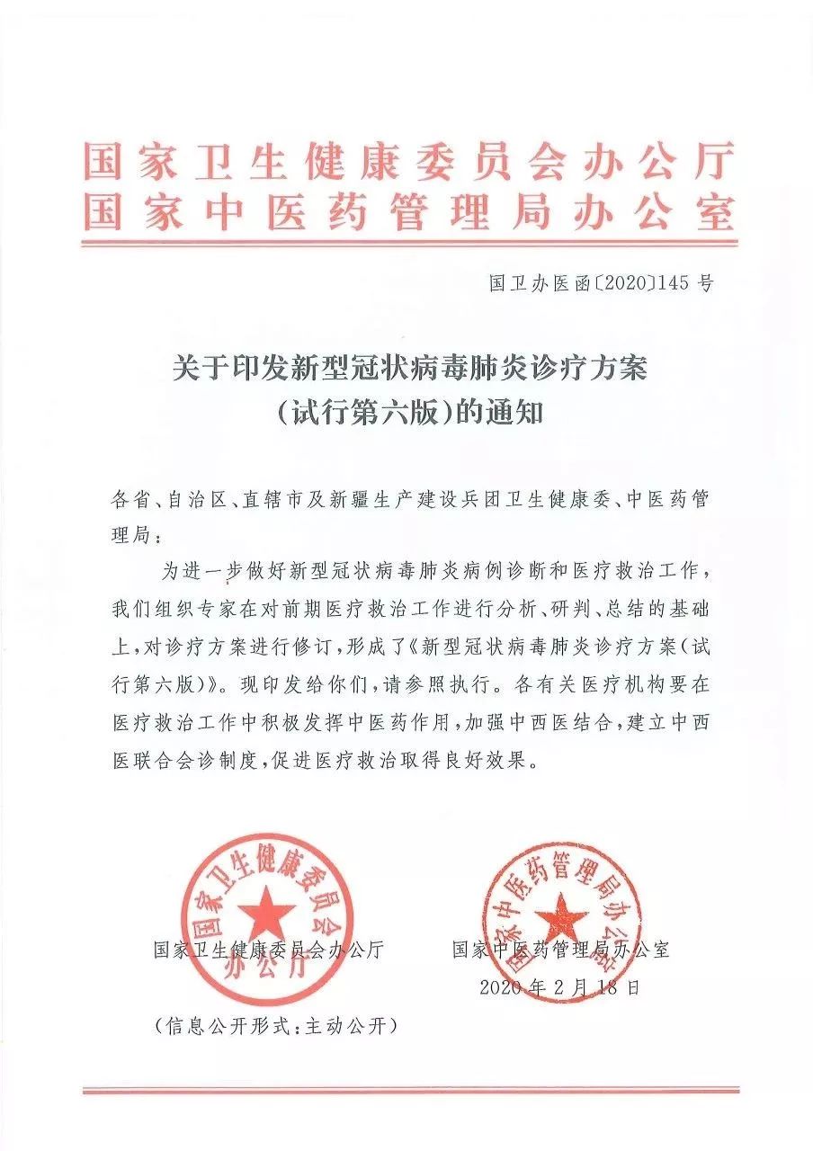 2020年2月18日,国家卫健委办公厅发布《关于印发新型冠状病毒感染的肺炎诊疗方案(试行第六版)》。相比第五版,第六版的诊疗方案中增加了更详细的鉴别诊断内容,在治疗方面亦积累了大量的临床救治经验,抗病毒的药物有所增加,强化了多器官功能损失的对症支持治疗,修订了中医药治疗的方案,此外还增加了血浆的治疗方法。