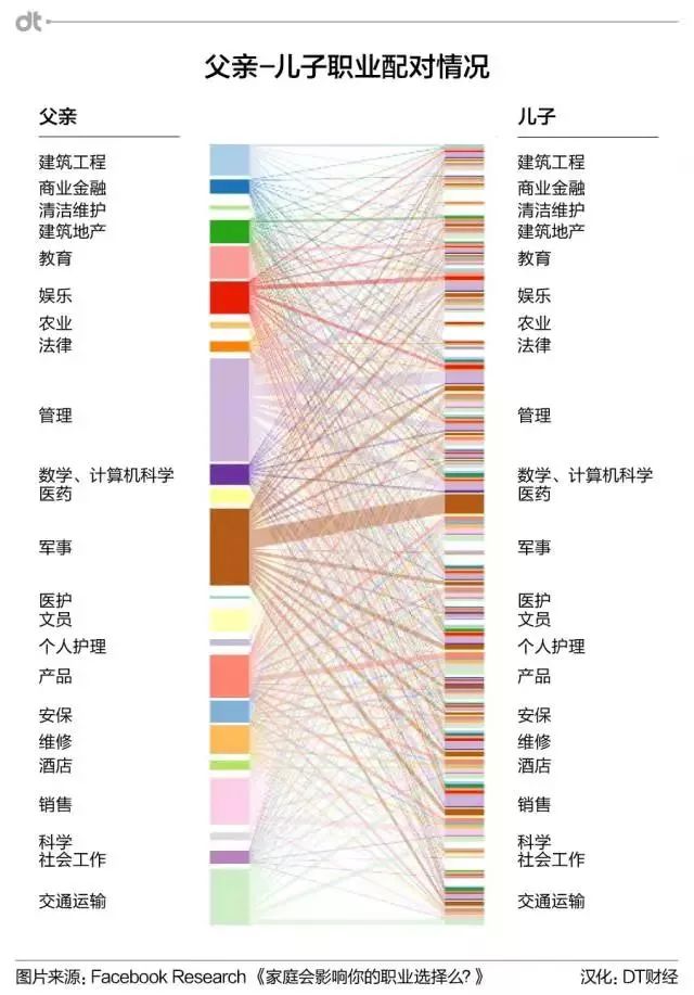 通过这样的可视化网络,我们可以了解父母与子女职业之间的联系。比如说,从蓝色的military(军事、军队相关工作)和蓝色的protective service(安保类工作)间这条线可以看出,父亲在军队中工作的话,儿子比平均水平更可能从事安保类的服务(DT君注:至少比平均水平高2.5倍以上)。