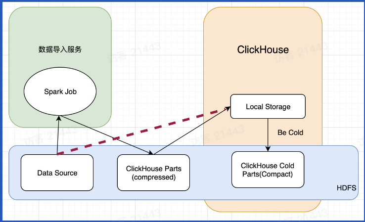 对于数据写入影响查询服务性能的问题,则考虑把数据写入服务放到查询服务外部。当导入数据量比较小的时候,直接用引擎自身的资源格式化之后放到本地存储;当数据量很大的时候,则由数据导入服务负责把外部数据源格式化 ClickHouse 能够识别的形式,完成数据排序、compressed 等构建工作,然后把结果写回共享存储里面,此时 ClickHouse 只需要把格式化好的源数据拉取过去注册一下就可以查询了。当数据达到一定的生命周期、查询频率降低后,再把数据重新 down 到 HDFS 上。