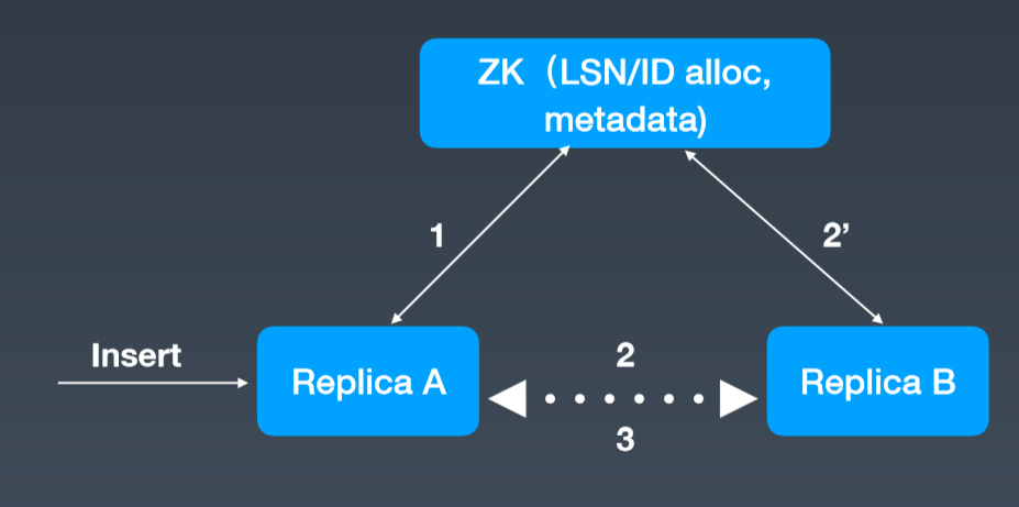 为了解决问题,团队基于 MergeTree 存储引擎开发了一套自己的高可用方案,思路就是把更多 ZK 上的信息卸载下来,ZK 只作为 coordinate Service。只让它做三件简单的事情:行为日志的 Sequence Number 分配、Block ID 的分配和数据的元信息,这样就能保证数据和行为在全局内是唯一的。