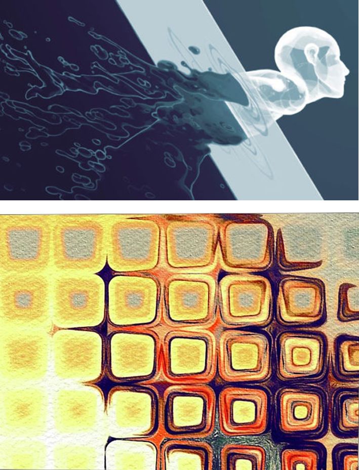 图2. 艺术家的相变作品。上图乃生物物理给出的生命,下图为流体构成的图腾。