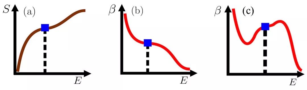 行文至此,笔者略有感慨。大自然似乎总有一种和谐,比如麦克斯韦方程组。我们似乎在微正则拐点分析方法中也略微感受到这种简洁、系统以及普适性。细心的读者也许发现:我们似乎漏掉了什么。如果拐点发生在图 7(c) 所示的β 曲线中呢?在这点处,β 随能量的变化同样是缓慢的,应该如何处理这种情况?笔者在初次考虑到这个问题时,也十分困惑。但如果仔细看,您会发现:在这个拐点周围,已经有回弯发生了。