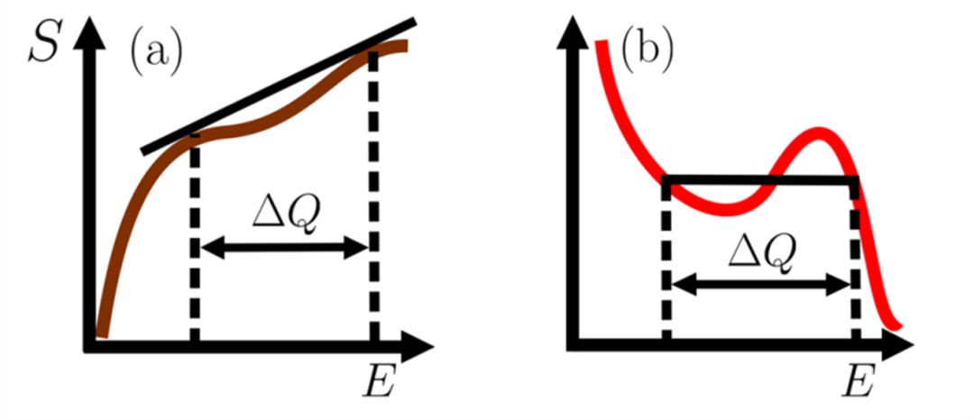 图6. (a) 一级伪相变发生时,系统的微正则熵随能量变化的曲线。其中,微正则熵会在相变处发生凹陷。图中的切线为吉布斯规则 (Gibbs construction) 所定,它被用来确定伪相变的相变区间。(b) 微正则熵的一阶导数β随能量变化的曲线。一级伪相变发生时,β会发生回弯。图中的水平线为麦克斯韦规则 (Maxwell construction) 所确定,它被用来确定伪相变的温度。
