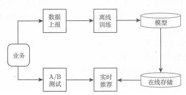如下图所示, 一个典型的基于离线训练的推荐系统架构由数据上报、离线训练、在线存储、实时计算和 A/B 测试这几个模块组成。其中,数据上报和离线训练组成了监督学习中的学习系统,而实时计算和 A/B 测试组成了预测系统。另外,除了模型之外,还有一个在线存储模块,用于存储模型和模型需要的特征信息供实时计算模块调用。图中的各个模块组成了训练和预测两条数据流,训练的数据流搜集业务的数据最后生成模型存储于在线存储模块;预测的数据流接受业务的预测请求,通过 A/B 测试模块访问实时计算模块获取预测结果。