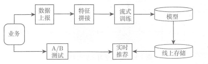基于在线训练的推荐系统架构适合于广告和电商等高维度大数据量且对实时性要求很高的场景相比较基于离线训练的推荐系统,基于在线训练的推荐系统不区分训练和测试阶段,每个回合都在学习,通过实时的反馈来调整策略。方面,在线训练要求其样本、特征和模型的处理都是实时的,以便推荐的内容更快地反映用户实时的喜好;另一方面,因为在线训练井不需要将所有的训练数据都存储下来,所以不需要巨大的离线存储开销,使得系统具有很好的伸缩性,可以支持超大的数据量和模型。
