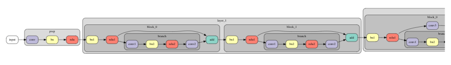 这时我们不禁提出一个问题:这种341秒训练出来的94%测试精度,在CIFAR10上的表现怎么样?该网络的架构是一个18层的残差网络,如下所示。在这个案例中,图层的数量表示卷积(紫色)和完全连接层(蓝色)的序列深度: