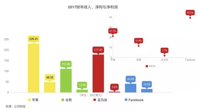 裹挟iPhone X的爆款效应,苹果收入环比增长13%至882.9亿美元,利润第一次达到200亿美元关口;谷歌的收入在过去的32个季度里持续保持平均20%以上的增长,至302亿美元;亚马逊收入跳涨38%至605亿美元,破天荒第一次给出超过10亿美元的利润;Facebook收入上扬47%,至129.7亿美元。