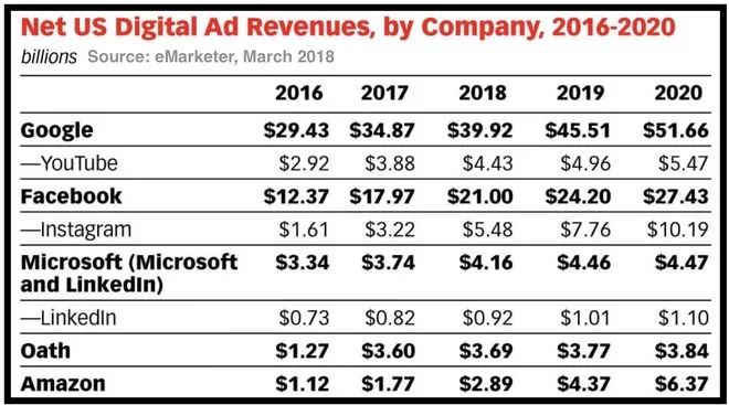 不过谷歌的后花园也不是固若金汤,之前提到有55%的网购者选择亚马逊作为搜索入口。对于广告商而言,亚马逊肯定不如谷歌看家的AdWords来得世故精妙,但其优势在于对消费行为的精准分析。而亚马逊一直号称广告界沉睡的雄狮(财报中未单列广告收入,据eMarketer估算2017年广告收入为17.7亿美元,与1780亿总收入相比就是一根毛),由于独掌用户海量、精准的购物数据,要破谷歌与Facebook在数字广告的双寡格局,非亚马逊莫属。