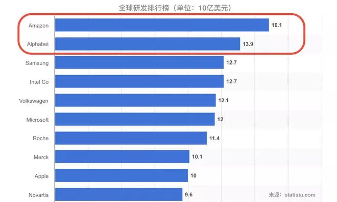 有人可能奇怪:垄断应该带来极高的利润率,但为什么谷歌和亚马逊利润率都很捉急。原因很简单——因为亚马逊和谷歌常年包揽全球研发狂人前二甲,挥金如土。世纪之交时亚马逊创造了一个估值新玩法——story telling。