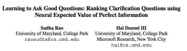 Learning to Ask Good Questions: Ranking Clarification Questions using Neural Expected Value of Perfect Information. Sudha Rao and Hal Daumé III.